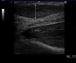 ※アキレス腱実質部に肥厚と内部高エコーが混在している。